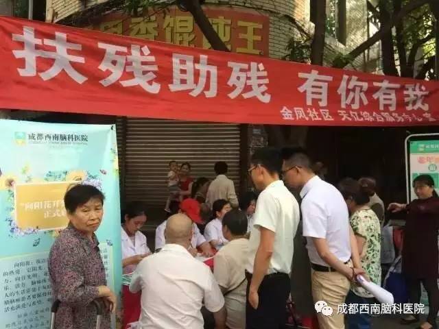在“5.21”助残日即将来临之际,金凤社区联合天亿综合服务中心于2017年5月19日上午,邀请“向阳花开公益行动”义诊团医生成都西南脑科医院的医务工作者,在辖区金凤街开展脑瘫儿关爱、帕金森、老年痴呆前期诊断等助残活动。此次活动旨在呼吁社会各界关爱残疾人尤其是脑瘫儿群体,给予他们包容、爱与帮助;呼吁关注脑健康、认识脑科学,掌握帕金森、老年痴呆等常见脑科疾病的早期症状,做到早预防、早发现、早控制。