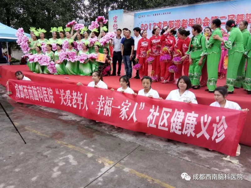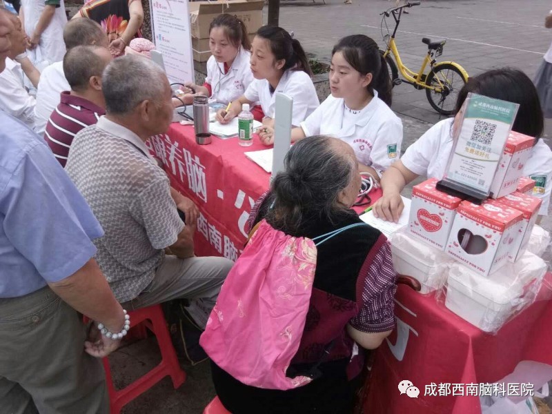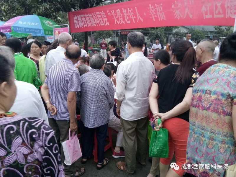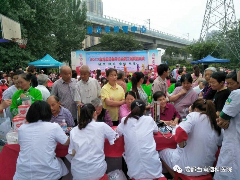 今天成都西南脑科医院的医生和护士们来到了成都市成龙街道老协活动现场,展开了主题为“关爱老年人 幸福一家人”的义诊活动。主要目的是为社区的老人们进行了老年病的知识普及和义诊,为大家传播老年痴呆、帕金森、脑萎缩等老年病的相关知识。