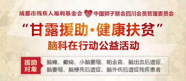 为进一步弘扬中华民族扶弱助残的传统美德,逐步形成全社会都来理解、关心、帮助残疾人的良好氛围,营造助残恵残的社会风尚;让残疾人更了解关心自己的身体健康,帮残扶残,共享和谐。由成都市残疾人福利基金会、四川省狮子协会主办、成都西南脑科医院承办的“甘露援助·健康扶贫”脑科在行动公益活动即将在全四川范围内展开,活动将充分利用各基金、协会公益平台及成都西南脑科医院技术优势,为四川省残疾群众给予援助,尤其对于因病致残、因残致贫的残疾群众给予医疗支持与爱心援助。