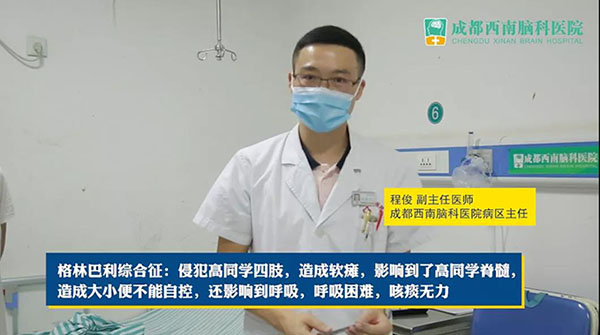 经过一系列检查,患者确诊为格林巴利综合征。程主任介绍说,现实中,很多人对格林巴利综合征并不了解,甚至一无所知,导致出现格林-巴利综合征症状时认为是别的病,可能错失较好治疗时机,或引起并发症等严重后果。一旦确诊患上格林巴利综合征,就应当尽早接受治疗。
