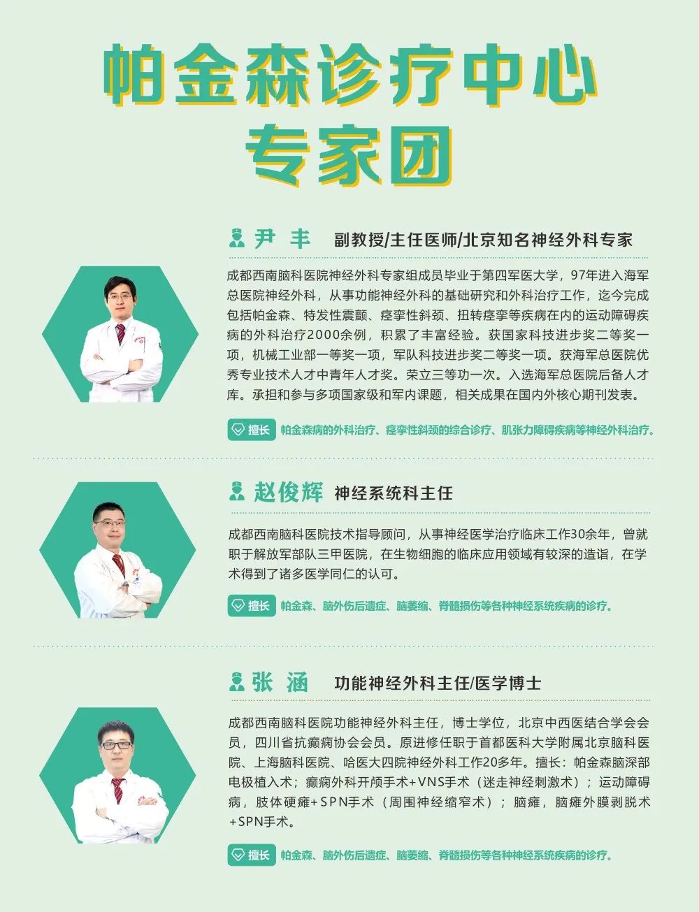 我院有专门针对帕金森疾病的诊疗中心,该中心在西南地区率先开展引导立体定向、脑深部电刺激(DBS)技术治疗帕金森,并逐步建立了以“4S”疗法为核心的帕金森病新模式。