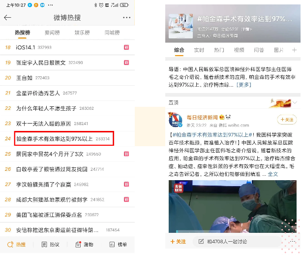 今日,#帕金森手术有效率达到97%以上#的话题登上微博热搜榜。话题讨论的帕金森手术,也就是我们常说的DBS(脑起搏器)手术。