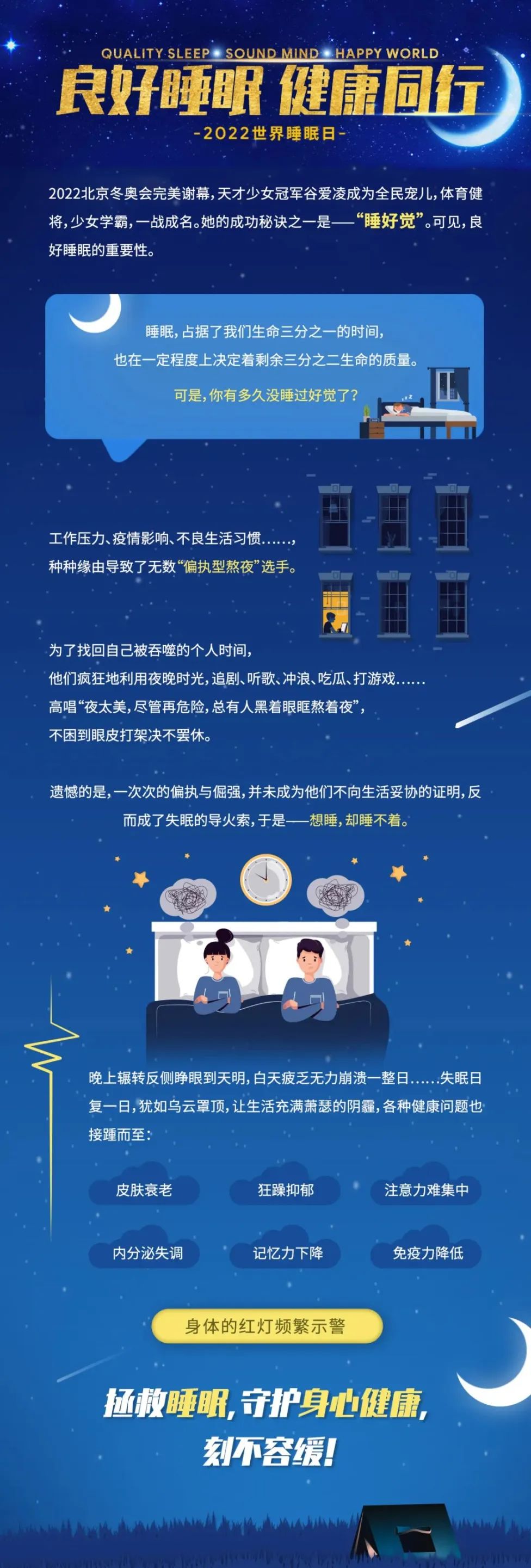 世界卫生组织调查显示,27%的人有睡眠问题。为唤起全民对睡眠重要性的认识,国际精神卫生组织主办的全球睡眠和健康计划于2001年发起了一项全球性的活动,将每年的3月21日定为“世界睡眠日”,今年中国的主题是“良好睡眠,健康同行”。