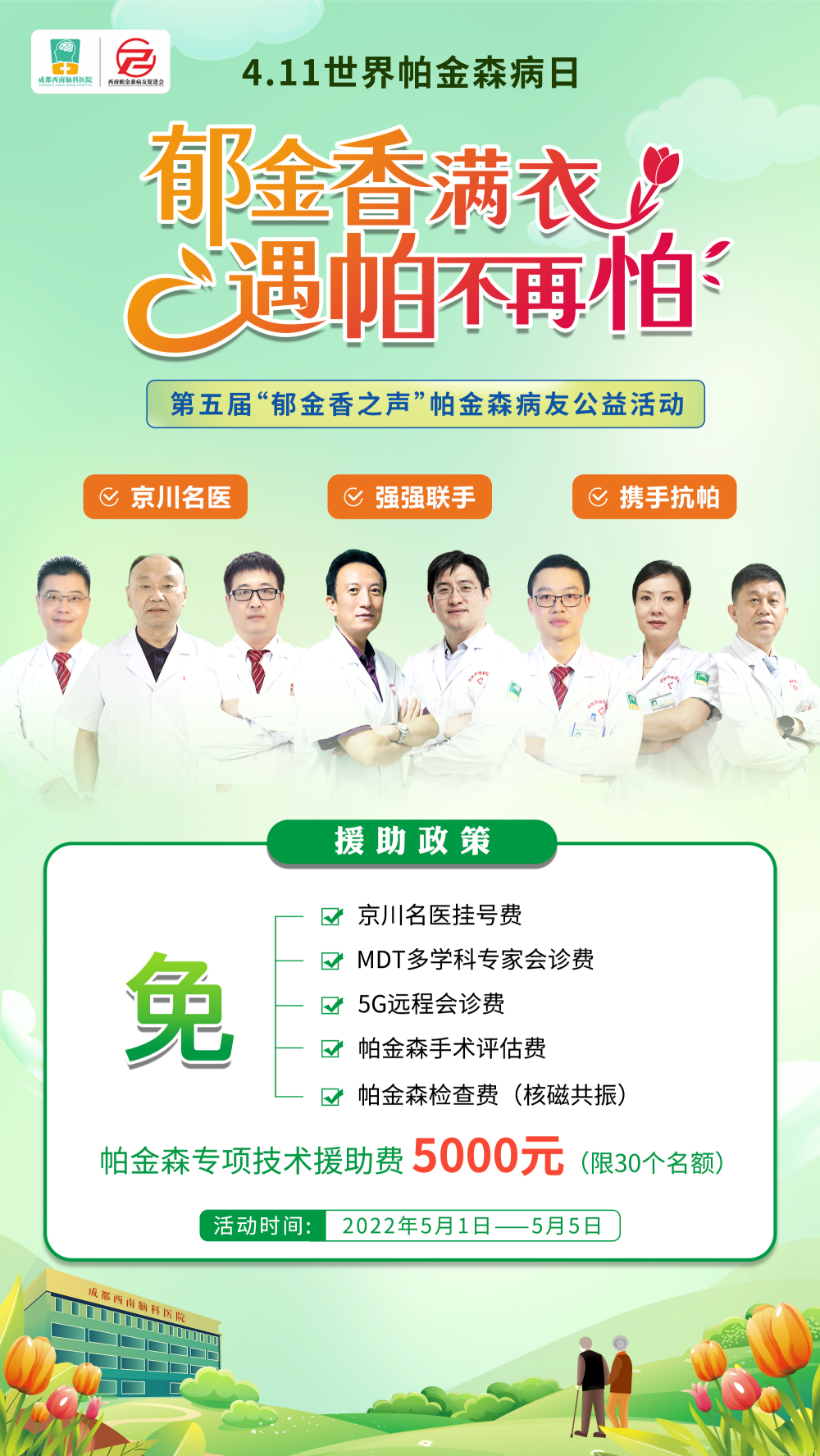 帕金森患者也不用太伤心,不能自驾游,我们可以想办法先治病!受疫情影响,很多帕金森患者对没能参加到4.11帕金森日的公益活动表示遗憾。对此,我院研究决定,将原定于4月9~13日开展的第五届“郁金香之声”帕金森病友公益活动,延期至5月1~5日,给予帕金森患者们更多实质性的帮助。