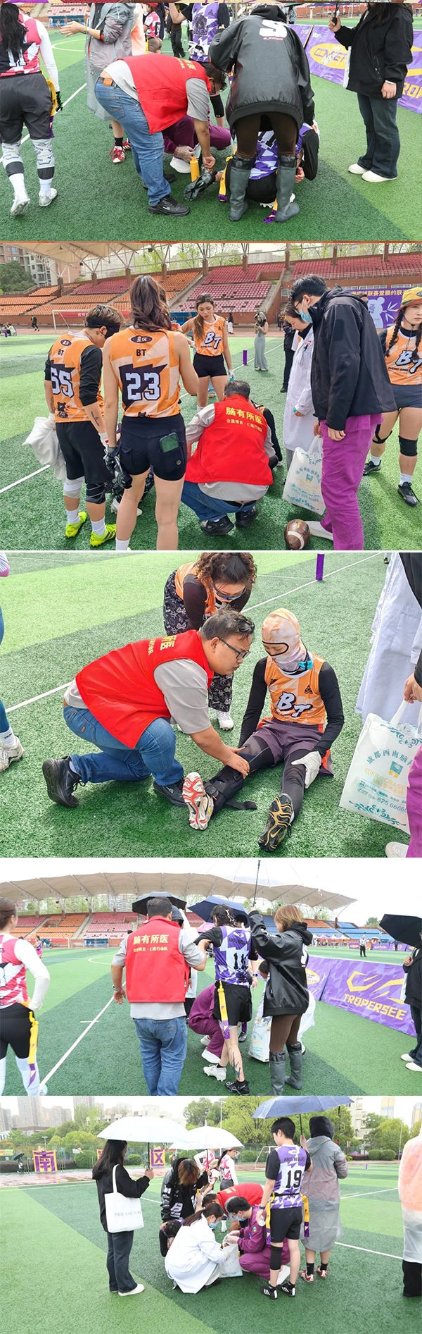 腰旗橄榄球运动对抗激烈,选手们在全力拼搏的同时,也可能面临意外受伤的风险。赛事期间,“仁医行动队”的急救医生、康复师和护理团队带着专业设备,在赛场旁搭建临时医疗点,随时准备应对突发状况。